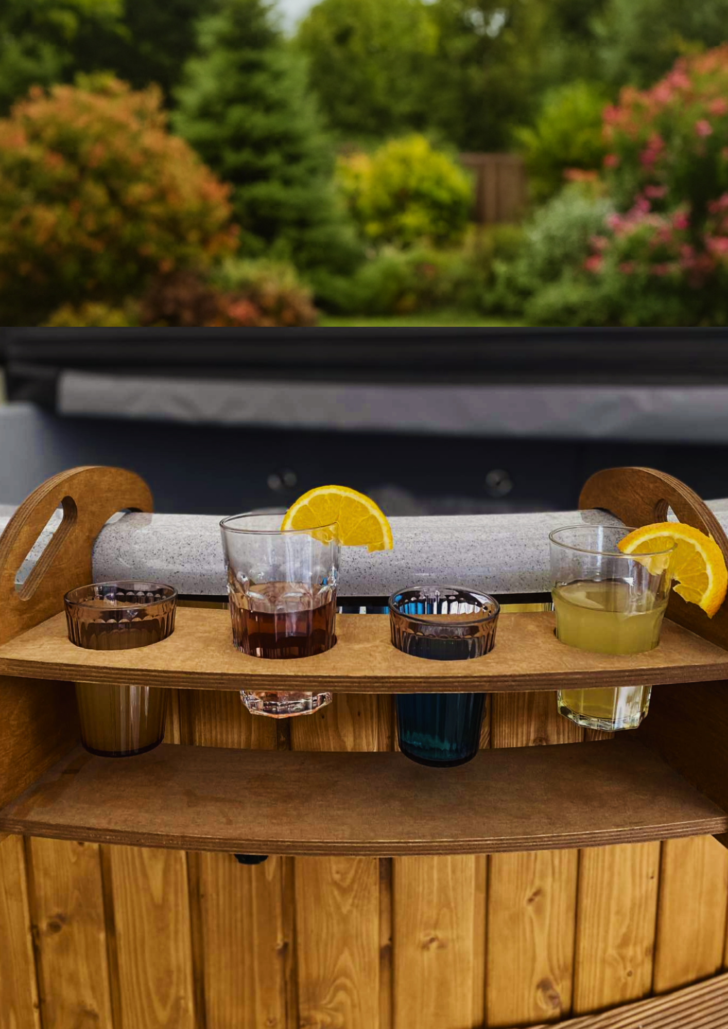 Dzięki minibarkowi nie trzeba wychodzić z balii, aby sięgnąć po napój czy inne rzeczy. Wszystko, co potrzebne, można mieć w zasięgu ręki.