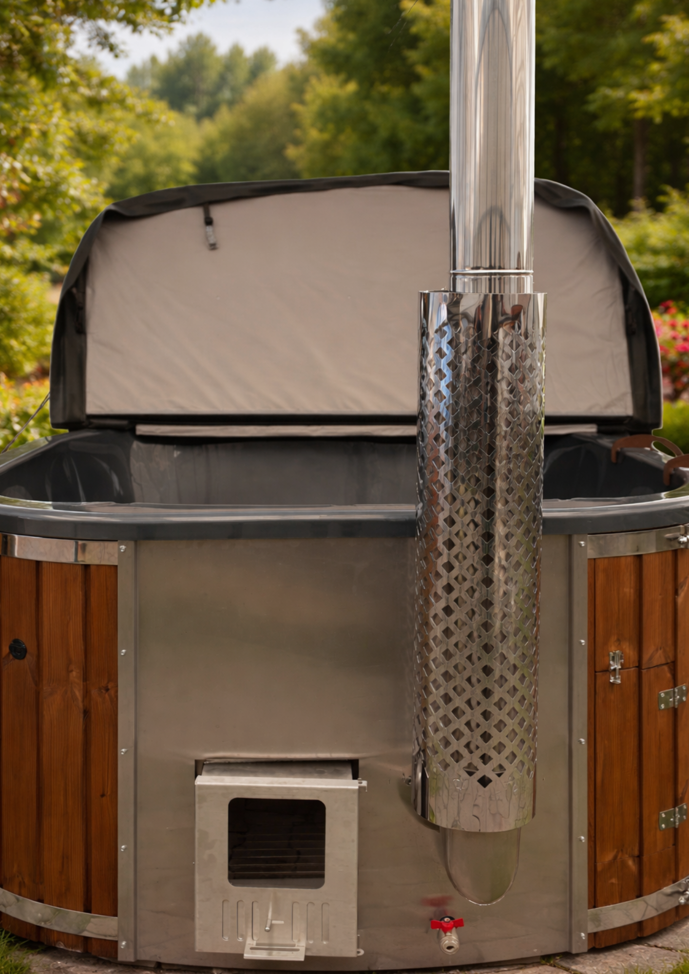 Osłona na komin do balii ogrodowej to niezbędny element wyposażenia każdej balii z piecem opalanym drewnem. Wykonana z wysokiej jakości stali nierdzewnej o grubości 0,5 mm, gwarantuje zabezpieczenie przed wysokimi temperaturami. Dzięki eleganckiemu, nowoczesnemu wykończeniu, doskonale komponuje się z każdym typem balii lub sauny ogrodowej.