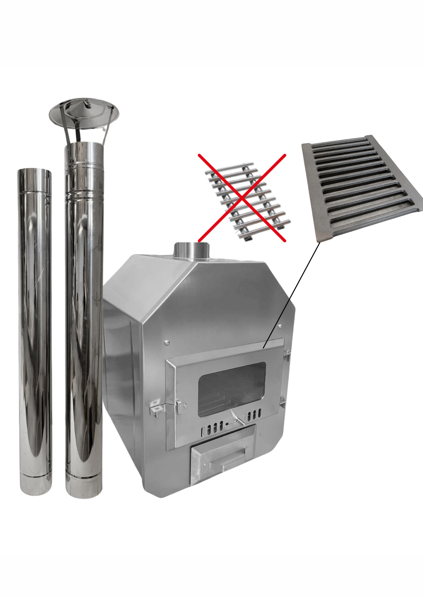 Unikalna sześciokątna konstrukcja pieca ułatwia odpowietrzanie komory, a żeliwny ruszt zamiast blaszanego daje mu wielokrotnie dłuższą żywotność. W piecach do balii najczęściej przepaleniu ulegają ruszty wykonane z giętej blachy. W tym modelu ruszt to ŻELIWNY ODLEW.