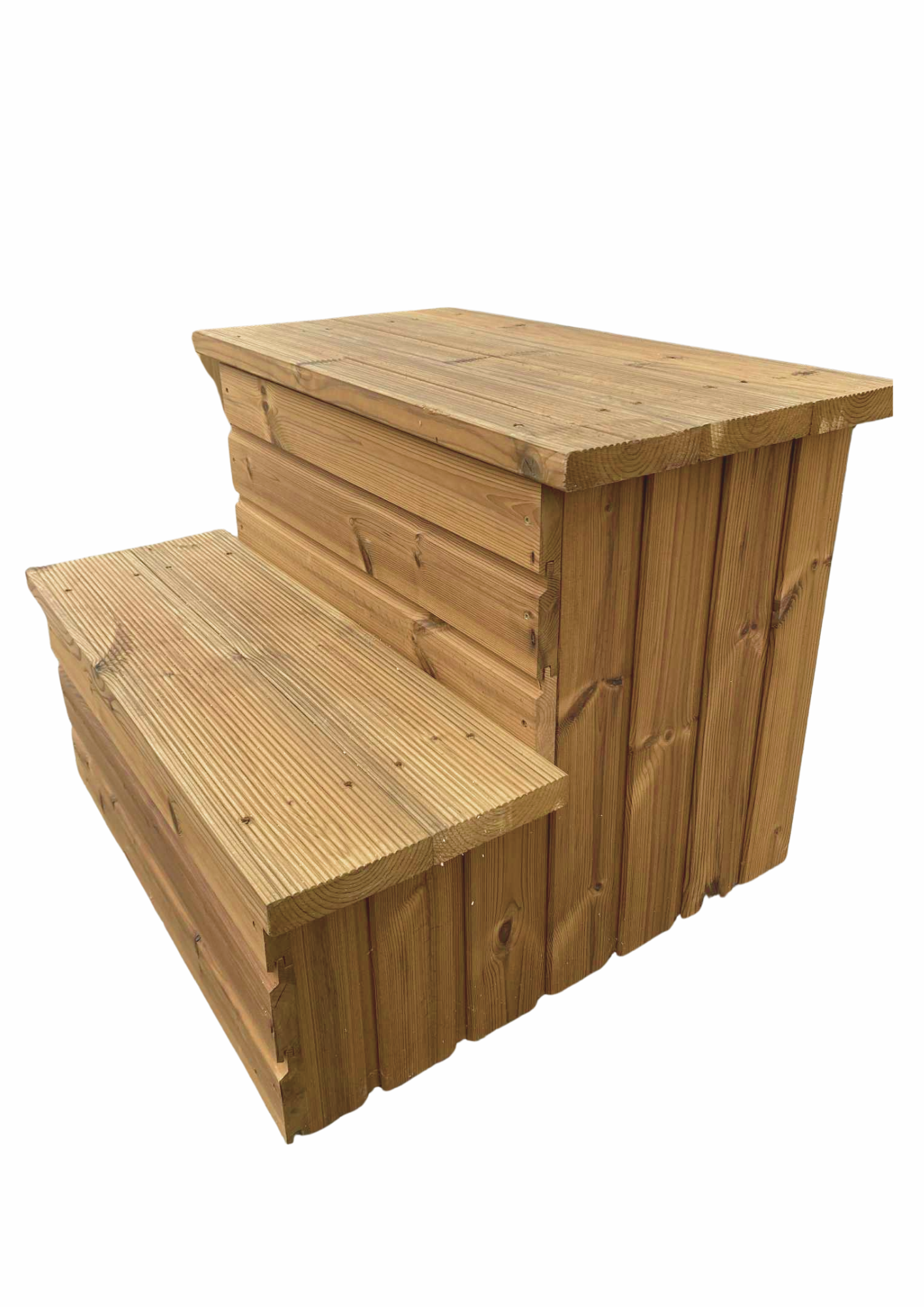 Schody z termodrewna (termososny) to elegancki i wyjątkowo trwały dodatek do każdej balii ogrodowej, jacuzzi lub ruskiej bani.